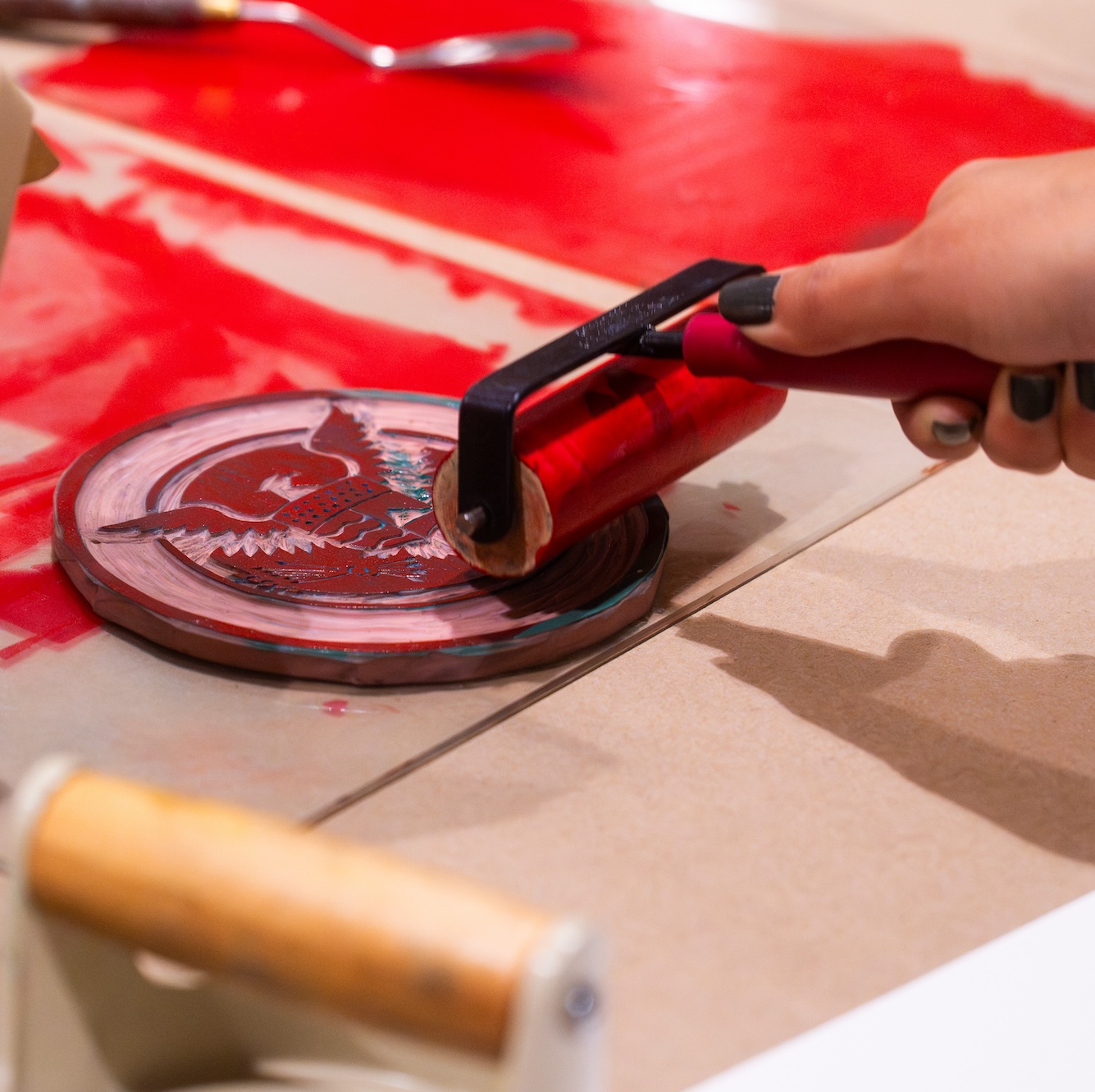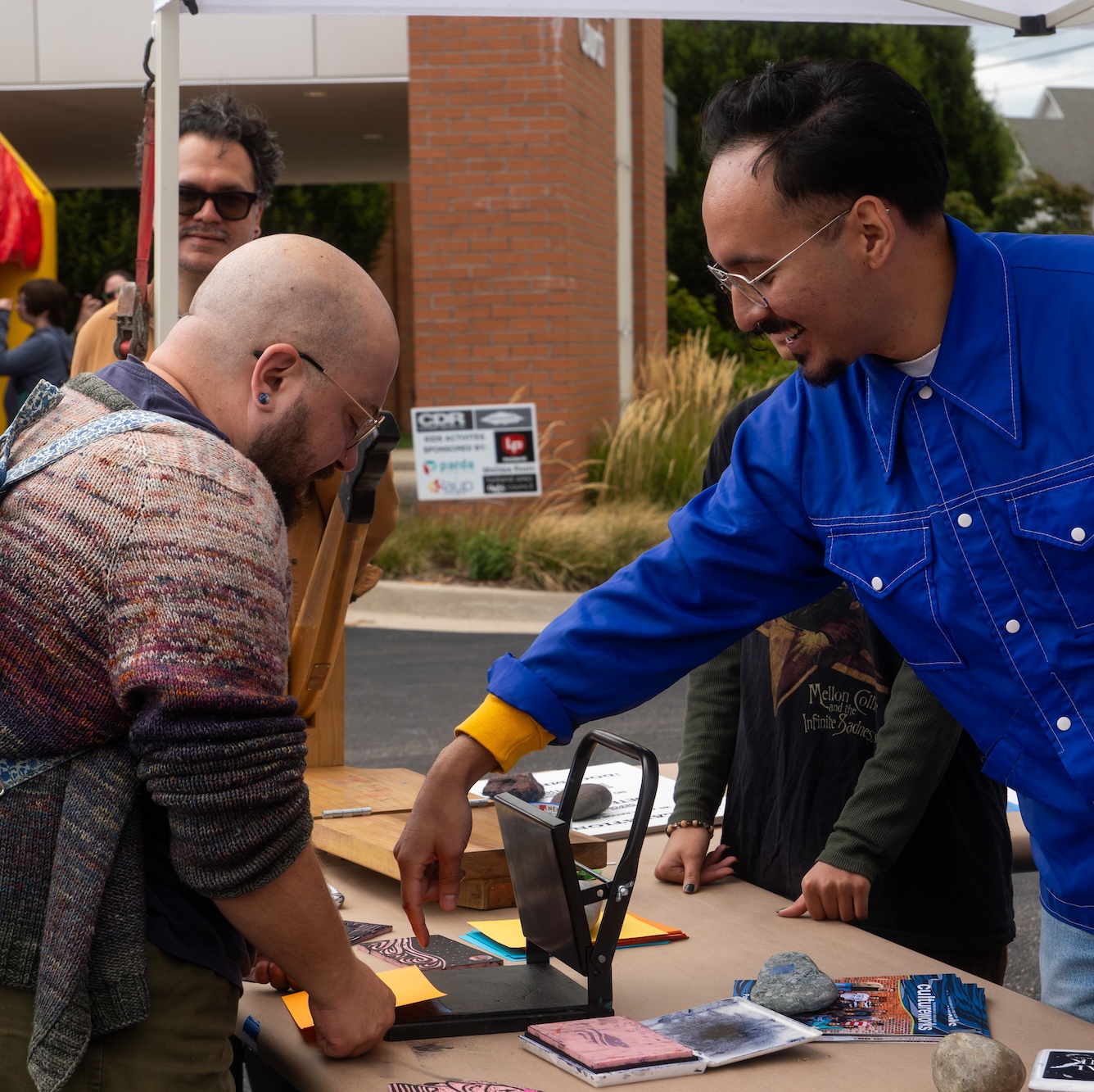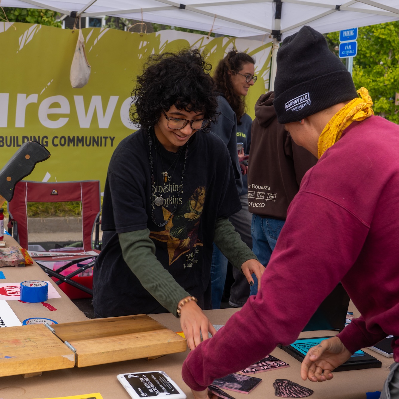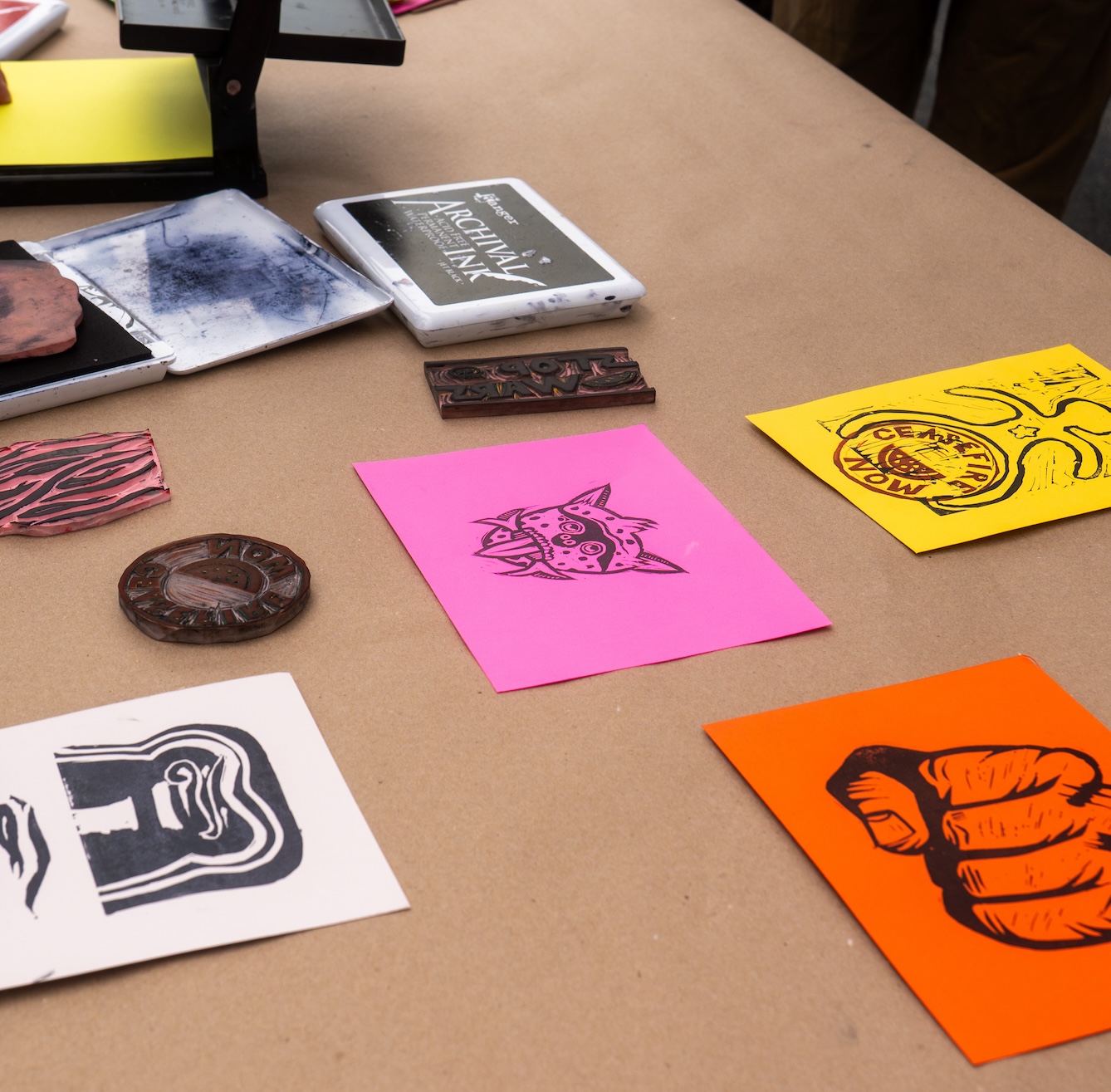 On Friday afternoon, 12 high school students learned more about Salvador’s artistic practice and carved blocks representing their own cultural identities. We test printed those blocks and then used them over the course of the weekend at our other events.